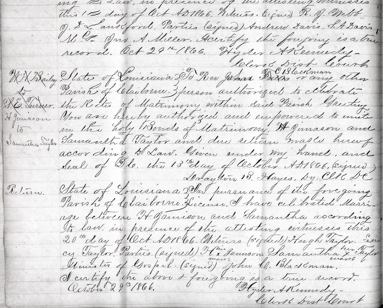 Law (state + Bureau practice): During Reconstruction, Louisiana repealed its interracial marriage ban in 1868 (it was later reinstated in 1894). The Bureau actively recorded marriages in Louisiana subdistricts (e.g., Bragg Home Colony, Donaldsonville, Mansfield, Shreveport, 1865–1866). EJI Calendar