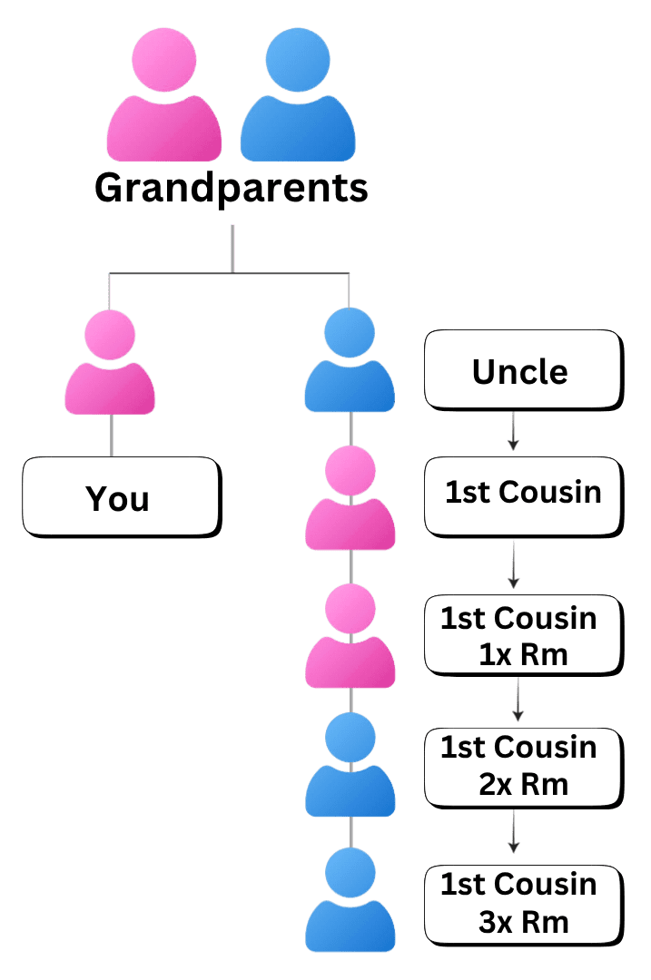 - Your 1st cousin’s child → your 1st cousin once removed (1× removed).