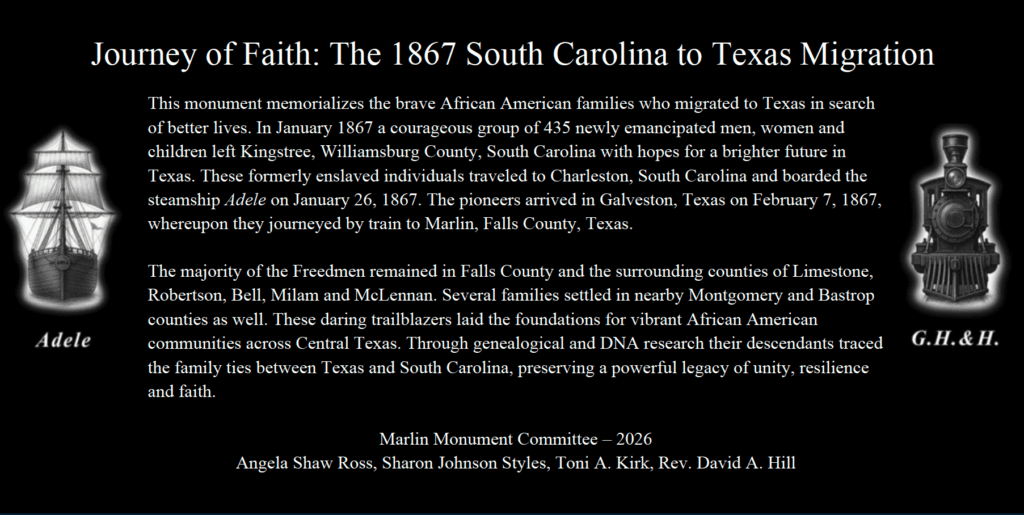 In the summer of 1867, 435 freed men, women, and children from Kingstree, South Carolina, completed a long and uncertain journey west. Having petitioned the Freedmen’s Bureau for transportation, they traveled by rail and ship to Galveston, Texas, before continuing inland to Falls County. Here, they began building new lives in the face of hardship and opportunity, establishing roots that would shape Texas communities for generations. The Marlin Memorial Project honors their arrival and preserves the legacy of resilience and hope they carried with them.